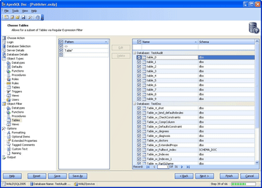 ApexSQL Docでオブジェクトフィルターテーブルのセレクション。